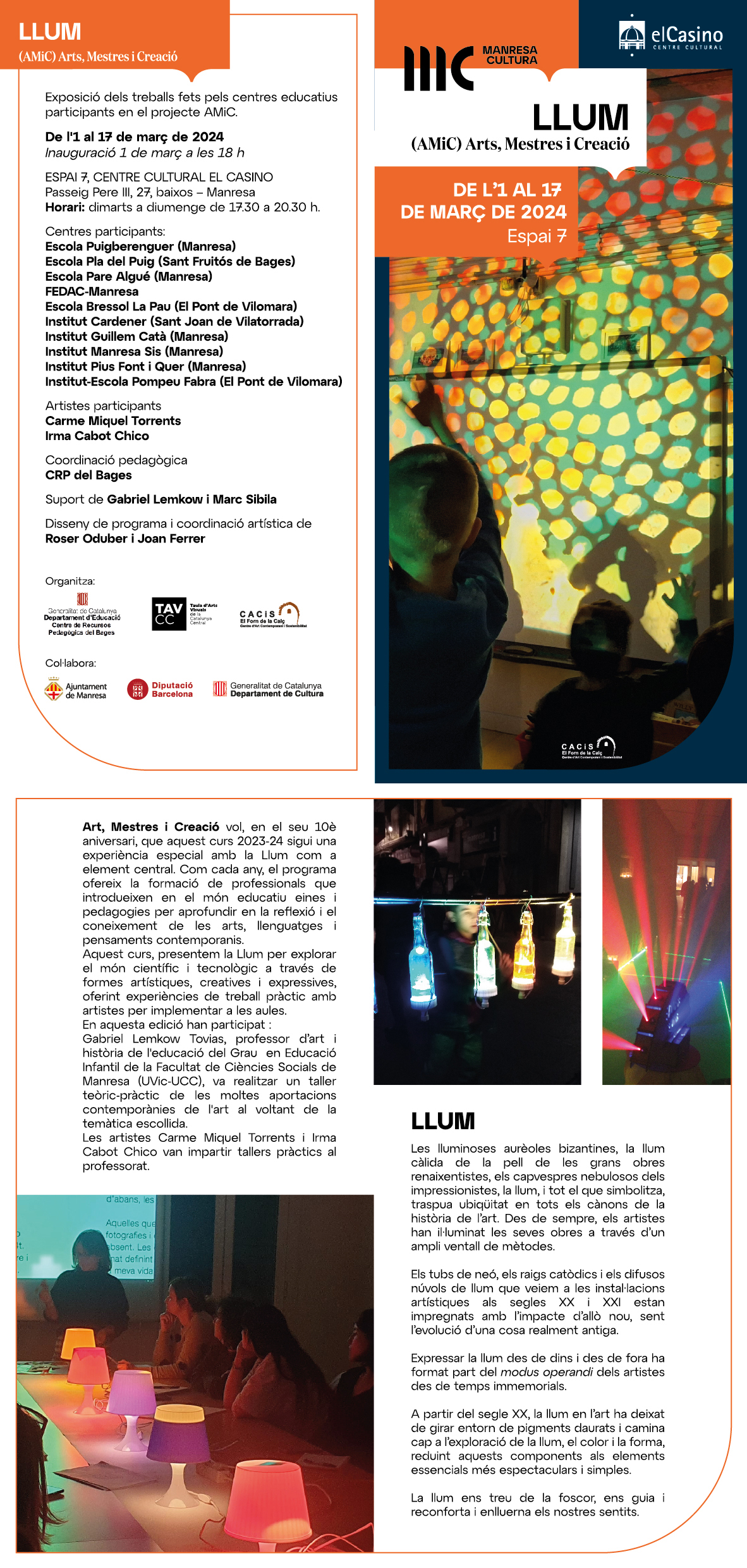 Art, Mestres i Creació vol, en el seu 10è aniversari, que aquest curs 2023-24 sigui una experiència especial amb la Llum com a element central. Com cada any, el programa ofereix la formació de professionals que introdueixen en el món educatiu eines i pedagogies per aprofundir en la reflexió i el coneixement de les arts, llenguatges i pensaments contemporanis.