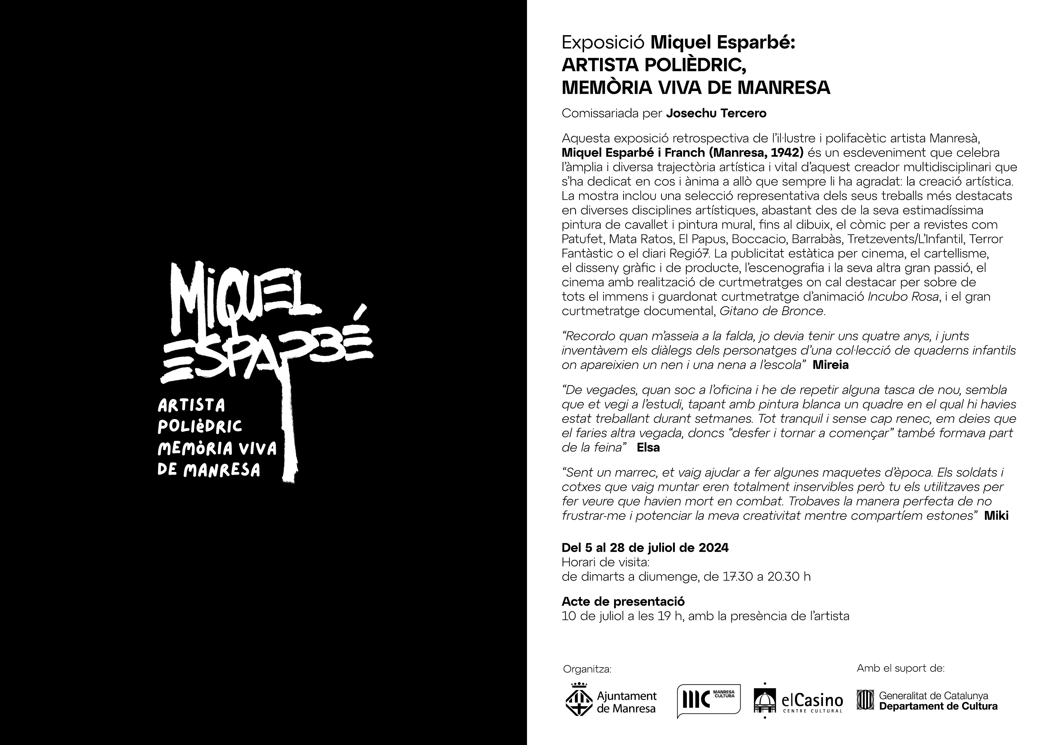 Exposició retrospectiva de l’il·lustre i polifacètic artista manresà Miquel Esparbé i Franch, és un esdeveniment que celebra l’àmplia i diversa trajectòria artística i vital d’aquest creador multidisciplinari que s’ha dedicat, en cos i ànima, a allò que sempre li ha agradat: la creació artística.