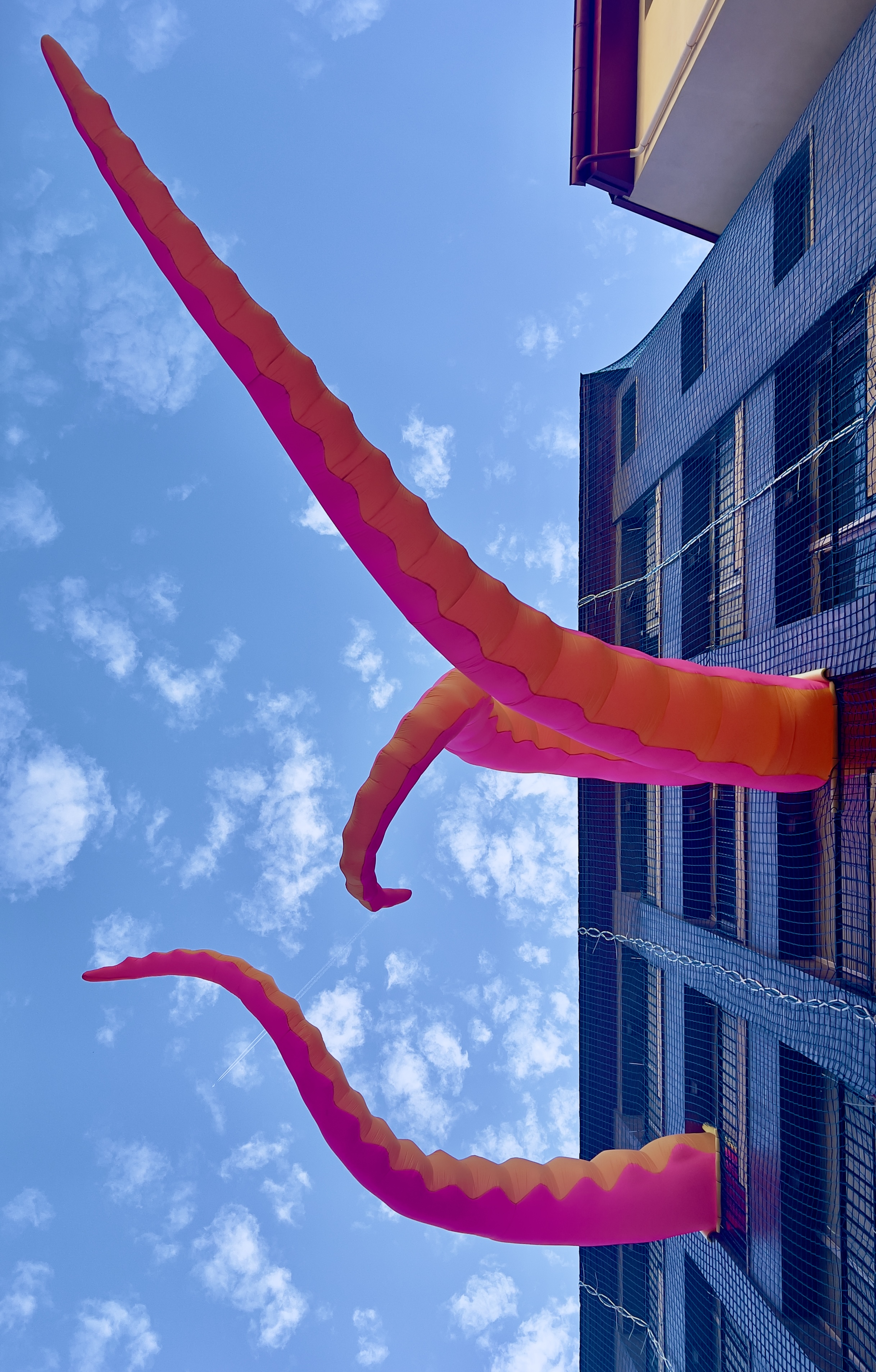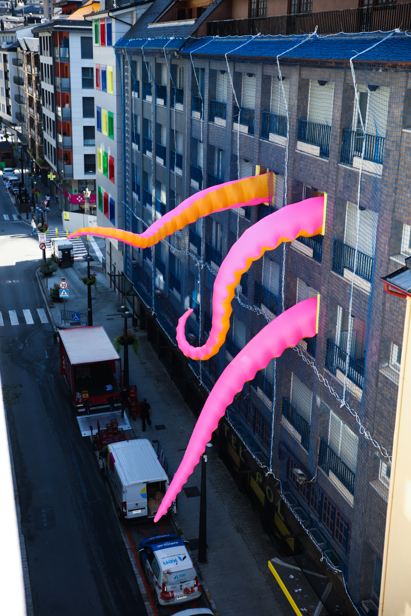 Kraken Interior és una intervenció monumental i efímera que transforma l’espai arquitectònic en un paisatge surrealista ple de color, sorpresa i humor. Uns tentacles inflables gegants irrompen per finestres i balconades, transformant el nostre entorn quotidià i convidant els visitants a qüestionar la relació entre espai, natura i imaginari col·lectiu. Kraken Interior obre la porta a una experiència artística immersiva i inesperada, donant protagonisme a l’art efímer i efervescent.
