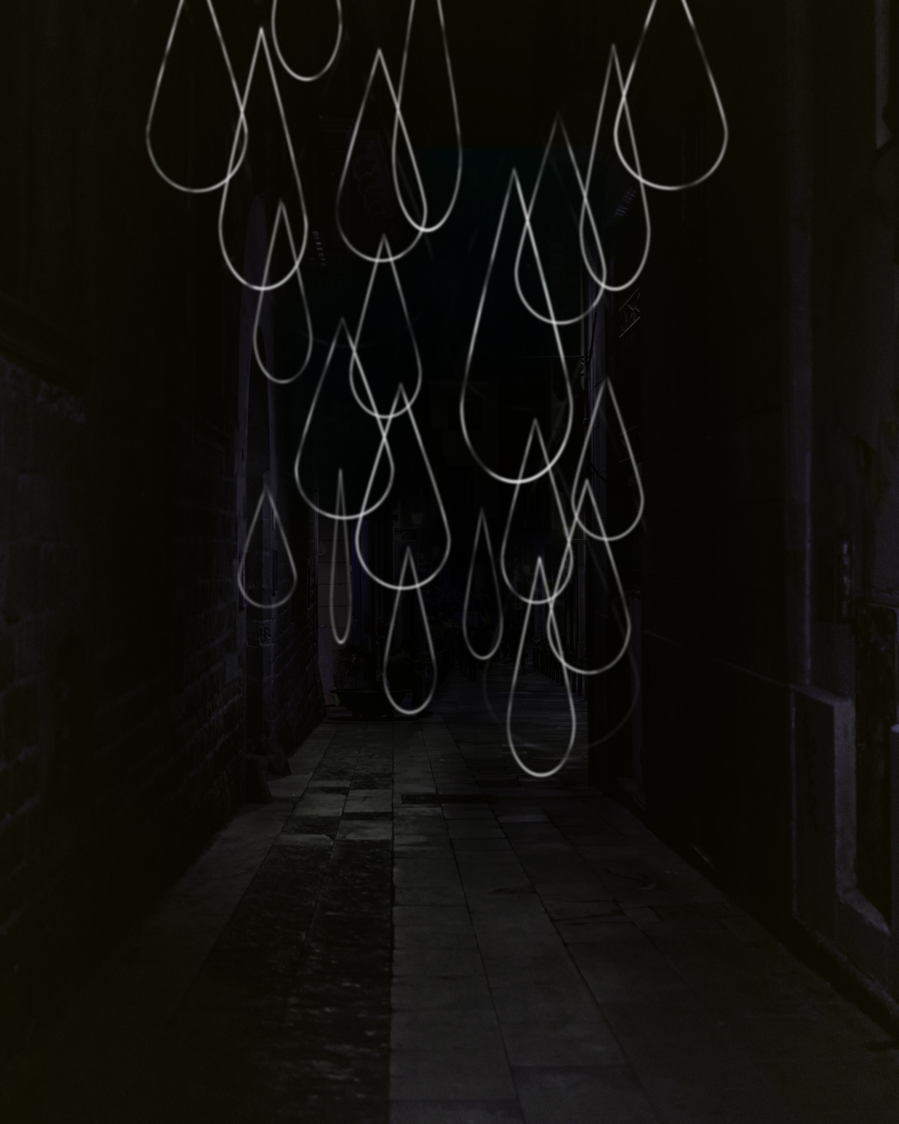 La instal·lació pren l’aigua com a element simbòlic central: per si sola, una gota és fràgil, lleugera i aparentment vulnerable, però quan s’uneix a moltes altres pot esdevenir força, moviment i transformació. Aquesta dualitat entre delicadesa i poder és el fil conductor de l’obra. La llum negra fa visibles les gotes en la foscor, reforçant la idea que allò que sembla petit o insignificant, pot brillar i adquirir presència quan es troba en l’entorn adequat. L’aigua esdevé així una metàfora directa de l’ésser humà: individualment som fràgils, sensibles i limitats, però col·lectivament tenim la capacitat de generar canvis profunds.