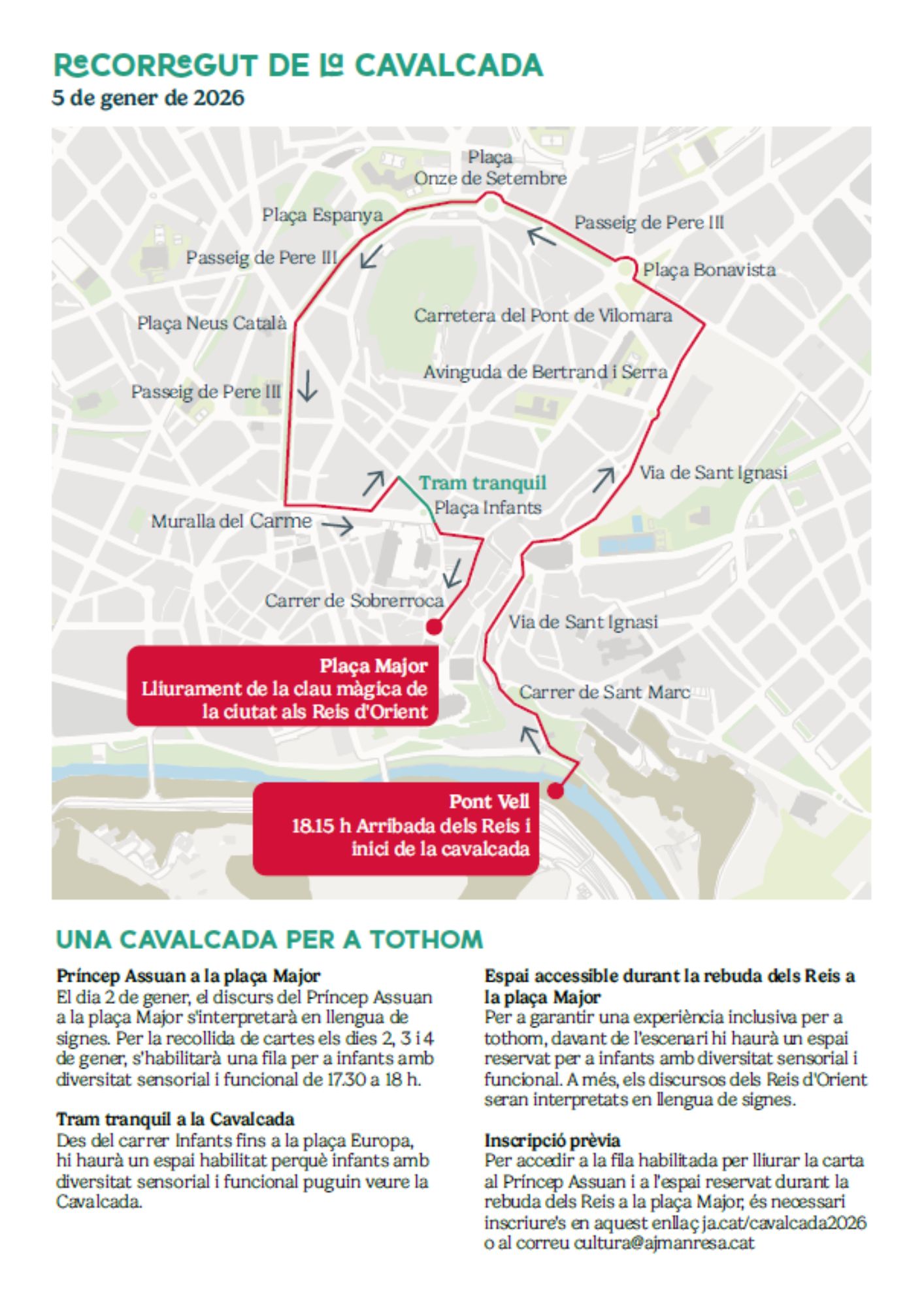 Recorregut de la Cavalcada de Reis: Pont Vell, carrer de Sant Marc, Via Sant Ignasi, plaça del Remei, avinguda Bertrand i Serra, carretera del Pont de Vilomara, plaça Bonavista, Passeig de Pere III, plaça Onze de Setembre, plaça Espanya, plaça Neus Català, Muralla Sant Domènec, Muralla del Carme, carretera de Vic, carrer Infants, plaça Infants, plaça Europa, carrer Joc de la Pilota, carrer Sobrerroca i plaça Major.