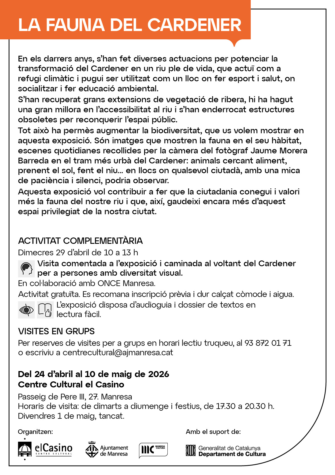 L'exposició 'La Fauna del Cardener' estarà oberta al públic de dimarts a diumenge, de 17.30 a 20.30 h. Les escoles i grups podran visitar l’exposició fora d’aquests horaris, sempre que ho sol·licitin amb anterioritat. Per la seva banda, el 29 d’abril es farà una visita a l’exposició amb sortida al riu per a persones invidents o necessitats visuals, que aniran acompanyades per personal del Centre Cultural el Casino. Es recomana a les persones interessades que reservin plaça.
